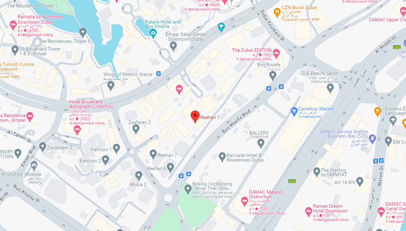 Reehan 1 находится в самом сердце Дубая в районе Downtown , среди ландшафтных садов в окружении цветов и зелени, в 10 минутах ходьбы от Бурдж-Халифа, Дубай Молла и Поющих фонтанов