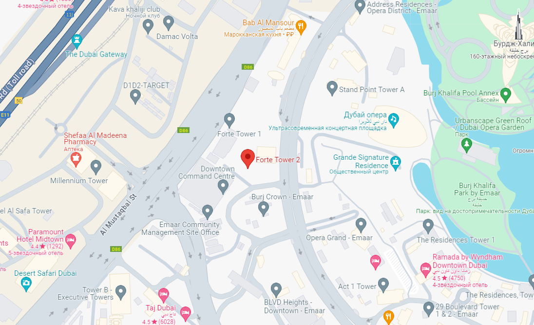 Forte Tower 2 находится в самом сердце Дубая в районе Downtown, в непосредственной близости к Бурдж-Халифа, Поющим фонтанам, Дубай Моллу и Дубайской Опере, рядом вся инфраструктура района