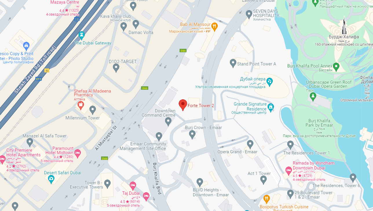 Forte Tower 2 находится в самом сердце Дубая в районе Downtown, в непосредственной близости к Бурдж-Халифа, Поющим фонтанам, Дубай Моллу и Дубайской Опере, рядом вся инфраструктура района